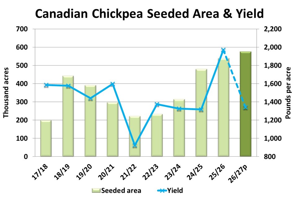 Just like other pulses, chickpea yields in 2025 at 32.8 bu/acre were close to a record while the five-year average is more than 10 bushels lower. If the 2026 yield ends up close to that average, it would more than offset the acreage increase and production could be down 29%. The difficulty for the chickpea market though is that the old-crop carryover from 2025/26 will be very large and could potentially leave next year’s supplies at record levels.