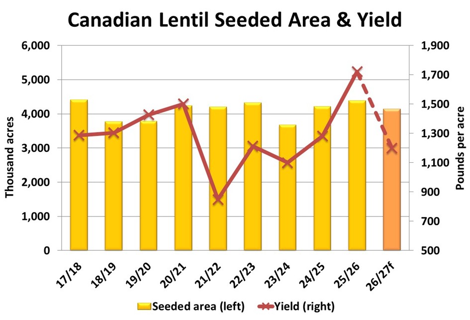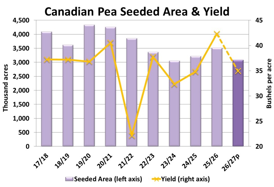 For peas, StatCan estimated 2026 seeded area at 3.08 million acres, down 12% from last year and lower than the five-year average of 3.4 million acres. This decline was not really surprising as frontline feedback was already pointing in that direction. Keep in mind, this survey was conducted prior to the announcement that China was dropping its 100% import tariff on Canadian peas. It is quite possible a few acres will be added back into the 2026 total.